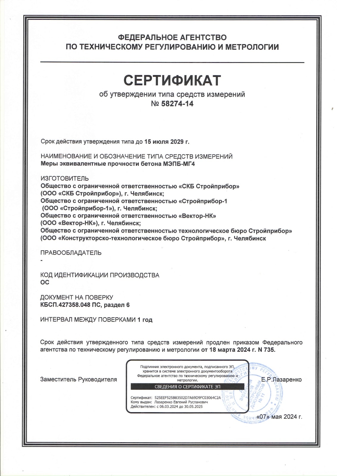 Меры эквивалентные прочности бетона МЭПБ-МГ4 предназначены для воспроизведения единицы ускорения, возникающего при взаимодействии индентора с мерой при постоянной энергии удара (Е=0,12 Дж), и значения прочности бетона. Меры применяются для поверки измерителей прочности бетона ИПС-МГ4.01, ИПС-МГ4.03, ИПС-МГ4.04, принцип работы которых основан на ударно-импульсном методе измерений прочности.